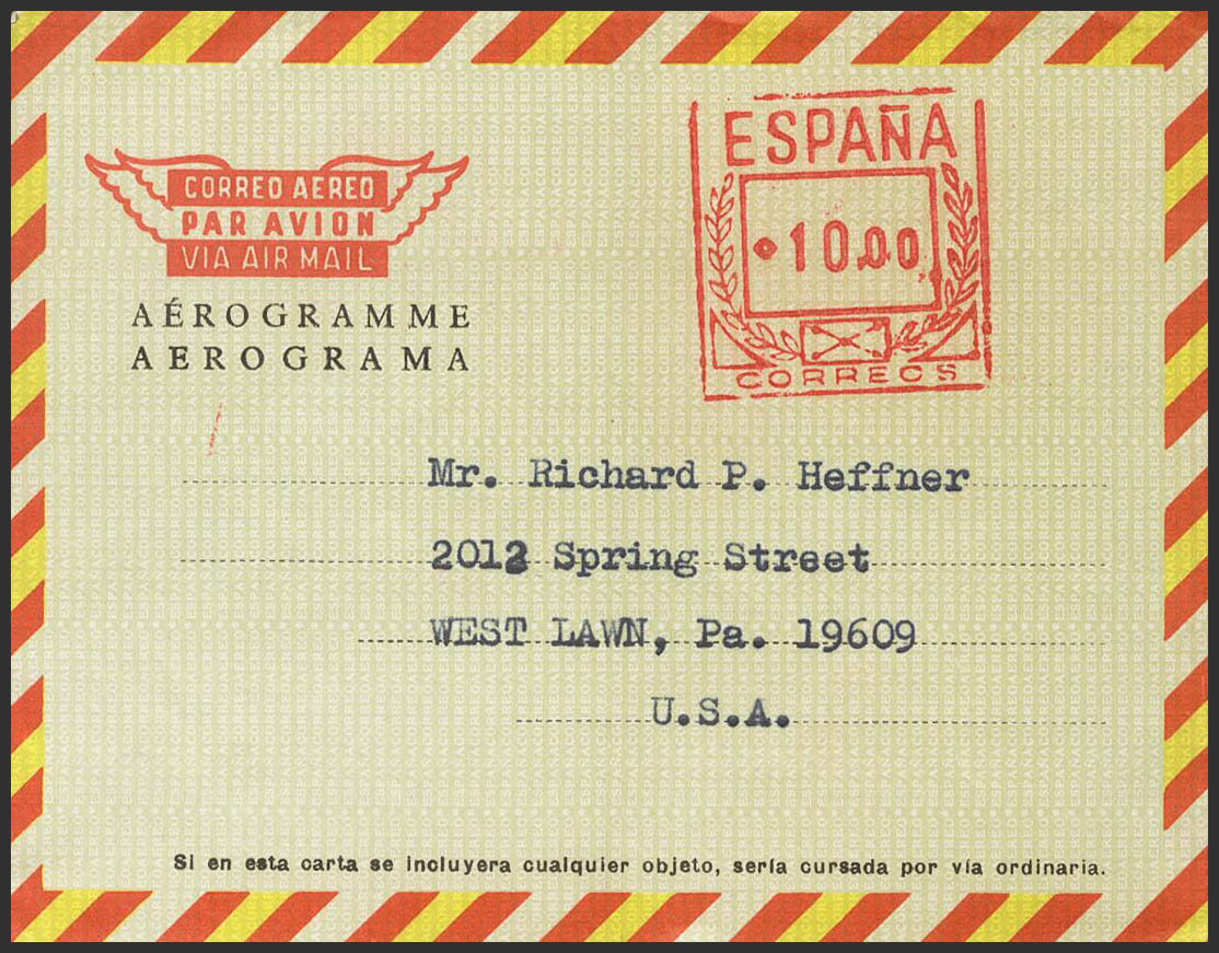 (★) AE104. 1967. 10 pts on aerogram (Type III without price). With the address registered but not circulated. MAGNIFICENT. Edifil 2017: 52 Euros