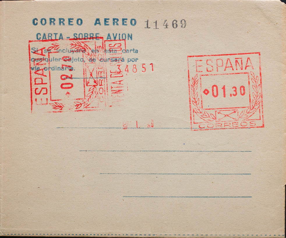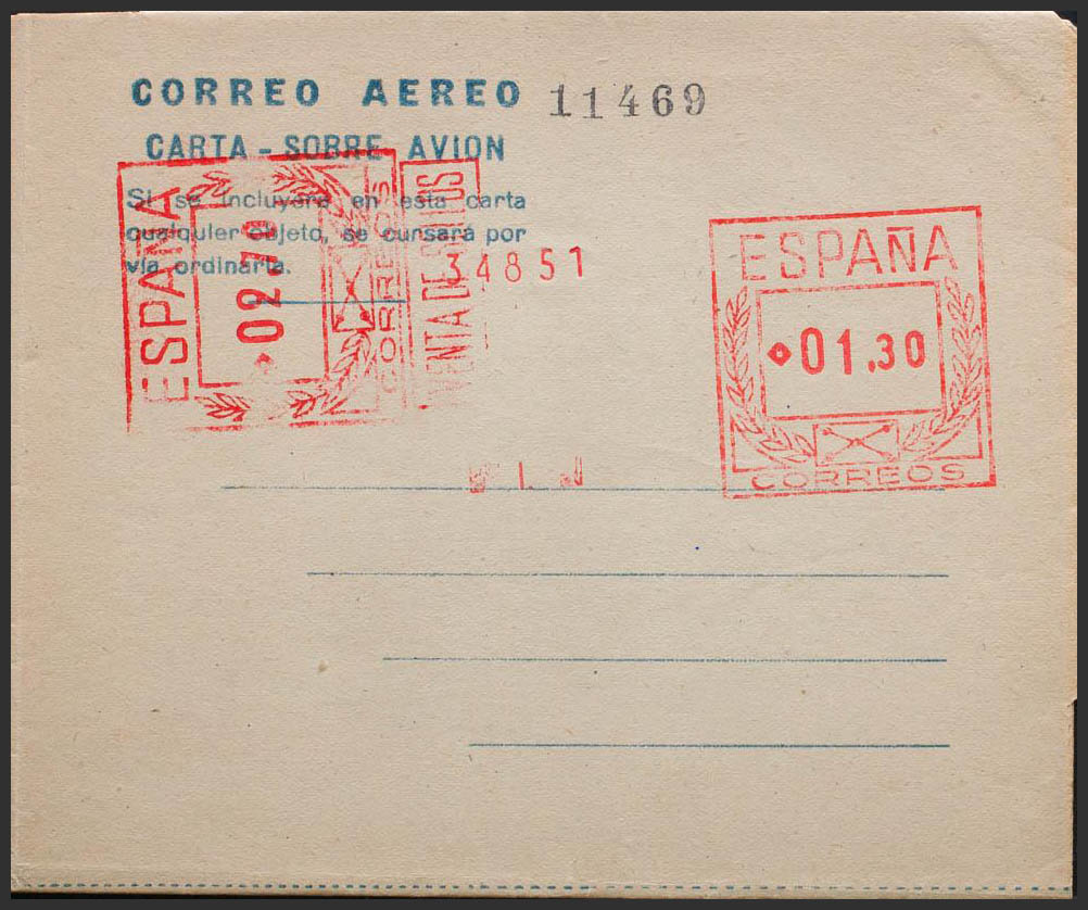 English (★) SA6. 1947. 1´30 pts + 2´70 pts on airgram with double postage, one horizontal, on light grey. MAGNIFICENT. (Laiz 2006, 150 Euros)