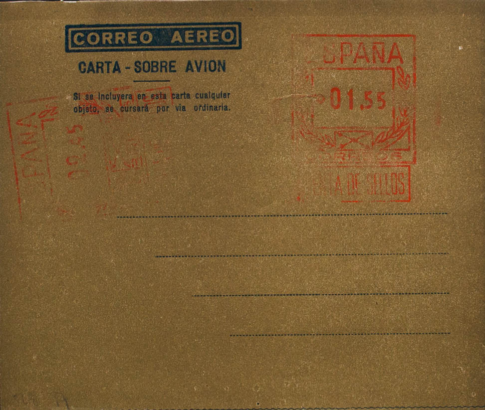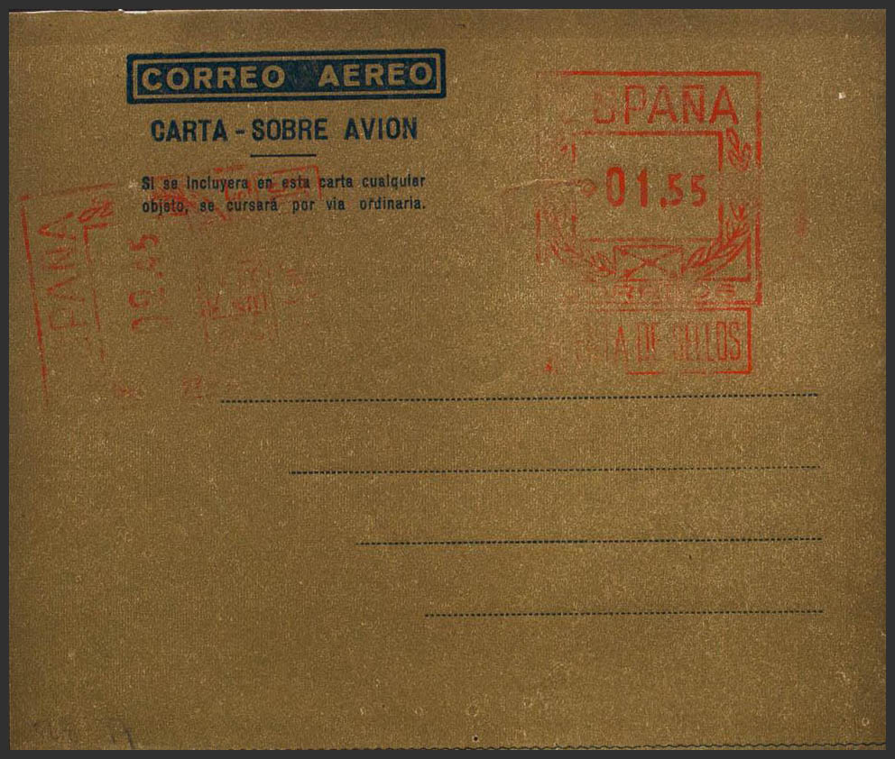(★) AE27Ca. 1948. 1.55 pts + 2.45 pts on airgram with double postage, one horizontal, on brown. MAGNIFICENT. (Laiz 2006, 230 Euros)