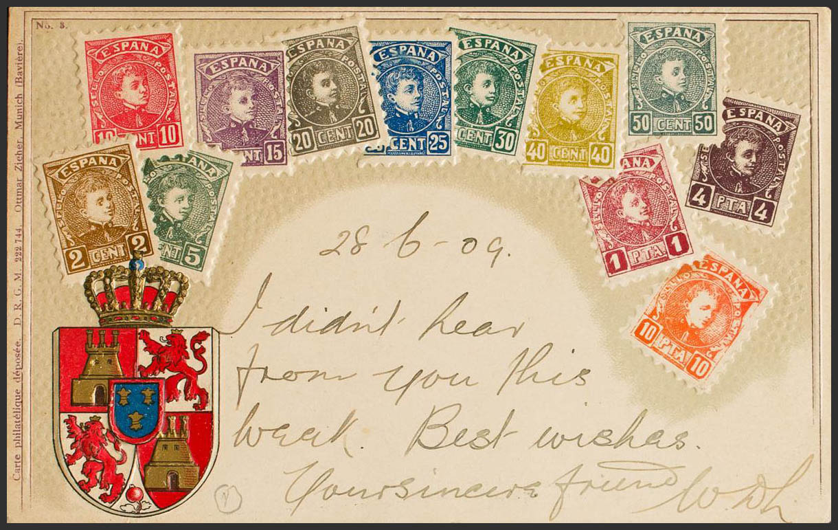 1909. Uncirculated postcard, with the reproduction of twelve values from the "Cadet" series. Edited by Ottmar Zieher, Munich. MAGNIFICENT.
