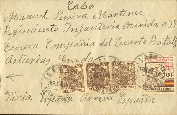 153. 1875. 10 chestnut cts and 5 cts SALES TAX. REUS to ALBACETE. MAGNIFICENT AND RARE USE OF THE TAX STAMP AS A WAR TAX STAMP.