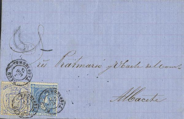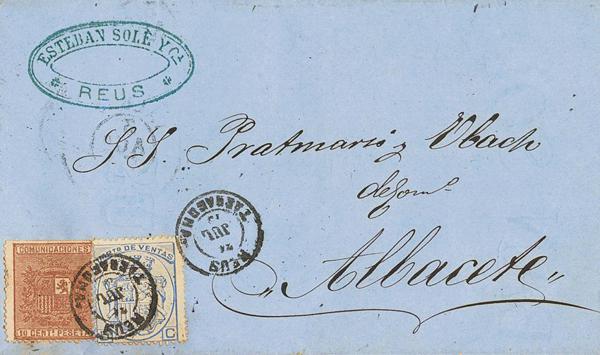164, Fis 1. 1875. 10 cts and 5 cts SALES TAX. REUS to ALBACETE. MAGNIFICENT AND RARE USE OF A TAX STAMP FOR POSTAL USE.