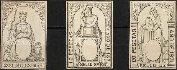 (★)1871. POLIZAS de 1871. 200 mils black, 10 pts black and 20 pts black (types of 1869 without shield). MAGNIFICENT AND RARE. (Germany 88, 94, 96)