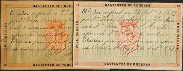 1864. MALAGA. NOTARY of 1864. 12 reales orange and green and 12 reales pink and green. ENOUGH OF POWER labels. MAGNIFICENT AND RARE.
