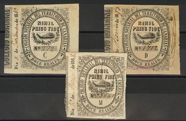 1868. CANARY ISLANDS. NOTARIES of 1868. 12 reales black, three fiscal (Series C, D and M). MAGNIFICENT AND RARE. (Fulcher 1659)