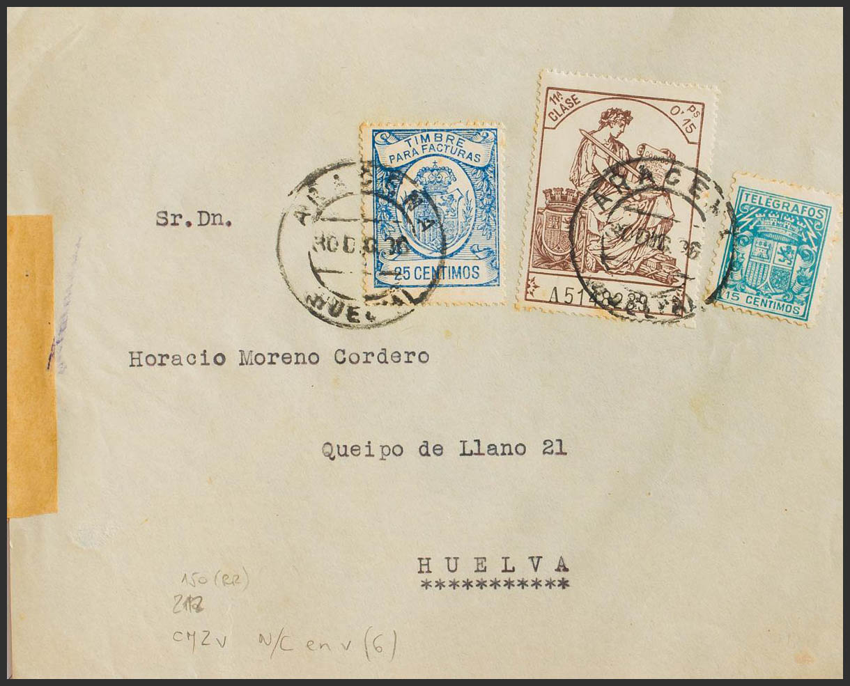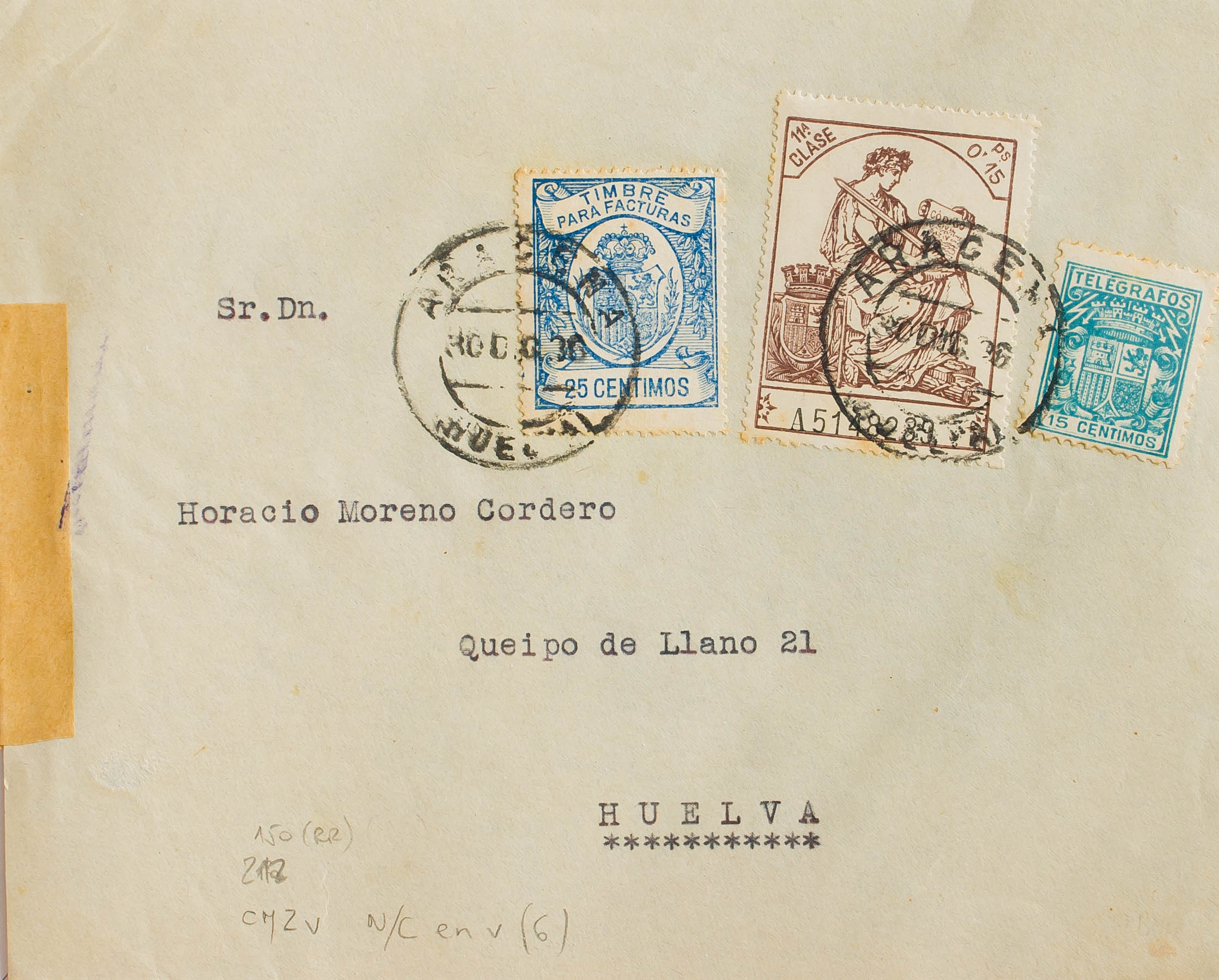 3. 1936. 25 cts blue, 15 cts chestnut and 15 cts telegraph blue. ARACENA to HUELVA. MAGNIFICENT AND RARE POSTAGE.