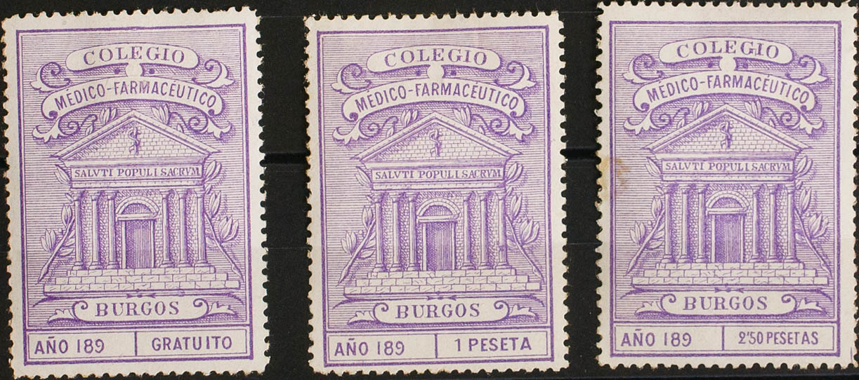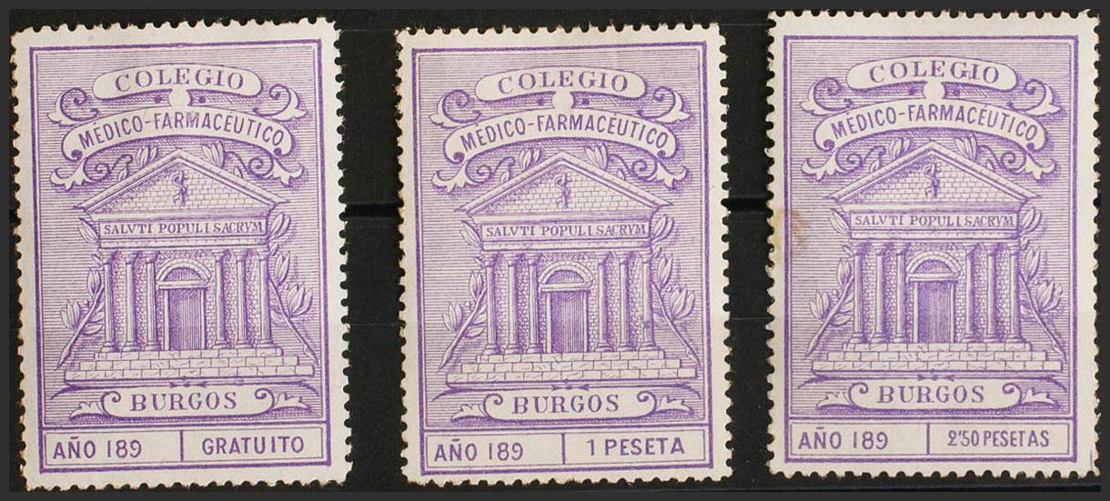 (★)(1890ca). COUNCIL TAX. BURGOS from (1890ca). 1 lilac sts, 2´50 lilac sts and "FREE", lilac. MEDICAL-PHARMACEUTICAL COLLEGE. MAGNIFICENT AND RARE.
