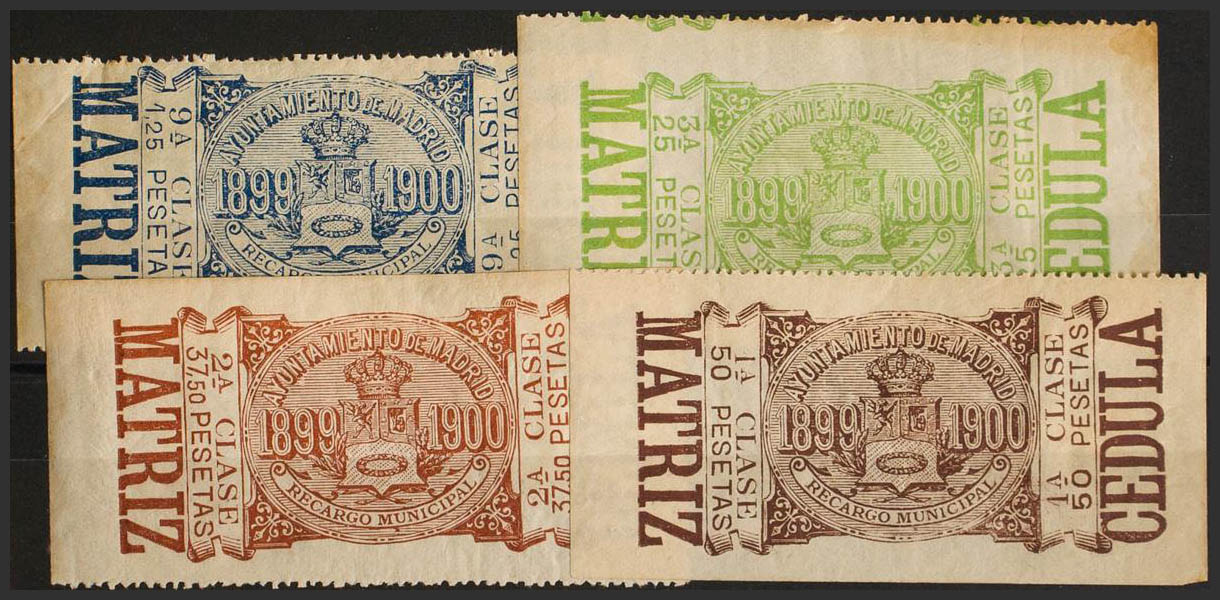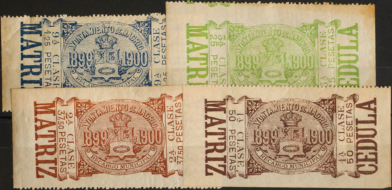 (★)1899. MADRID of 1899. MUNICIPAL TAX. Complete series, eleven values. MUNICIPAL SURCHARGE CERTIFICATES. BEAUTIFUL AND RARE. (Forbin 13/23)