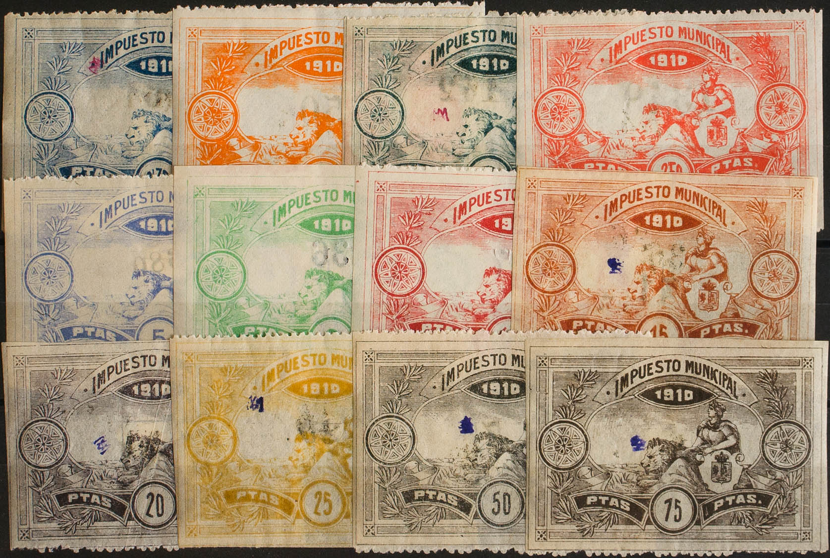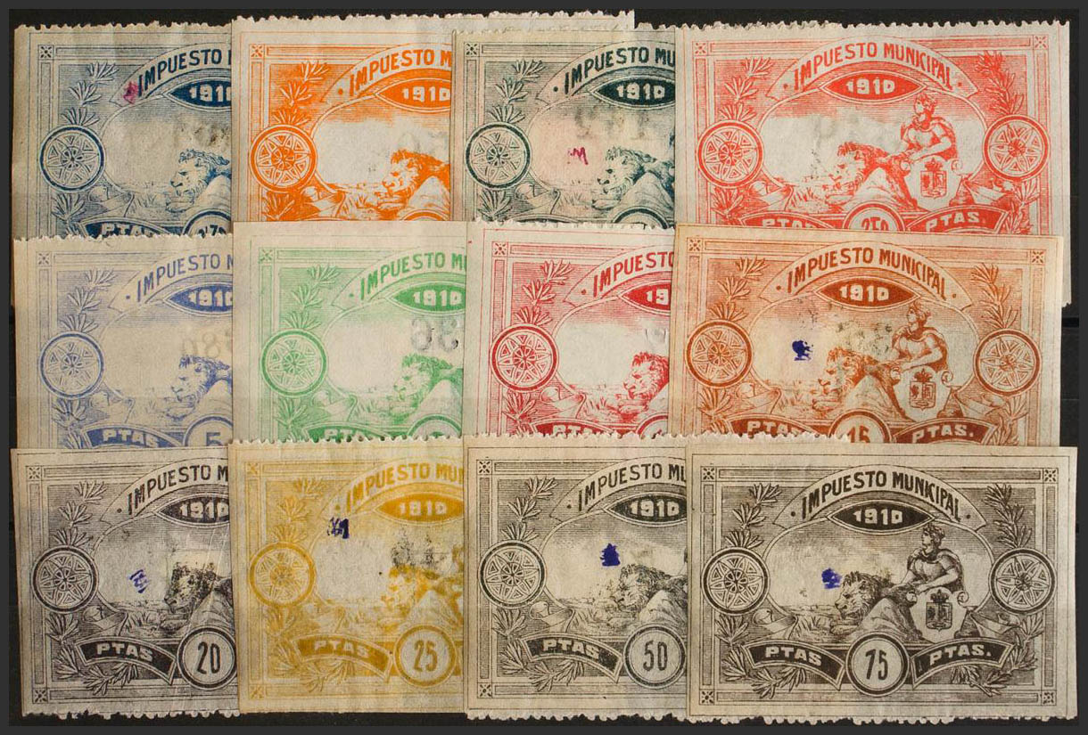 ★/(★)1910. MADRID of 1910. MUNICIPAL TAX. Complete series, twelve values. Overload "MA". MAGNIFICENT AND EXTRAORDINARILY RARE COMPLETE. (Forbin 246/57)