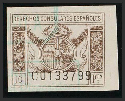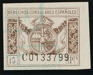 1929. DERECHOS CONSULARES of 1929. 10 pts chestnut (no teeth). MAGNIFICENT AND RARE. (Germany 21)