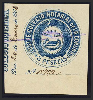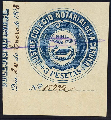 1908. LA CORUNA. NOTARIES of 1908. 3 blue pts. ILLUSTRIOUS NOTARY COLLEGE OF LA CORUÑA. MAGNIFICENT AND RARE.