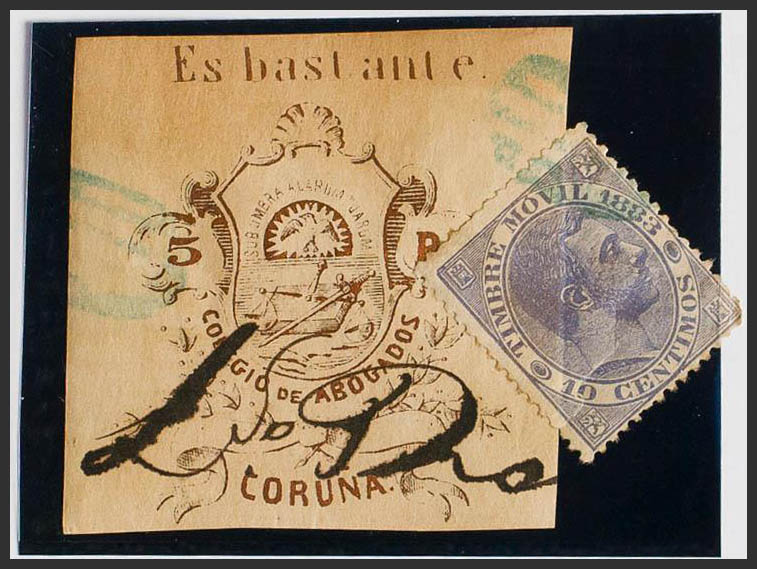 1879. LA CORUNA. COLLEGE OF LAWYERS of 1879. 5 pts bronze and Timbre-Mobile of 10 cts violet (defective). BEAUTIFUL AND RARE. (Fulcher 1794)