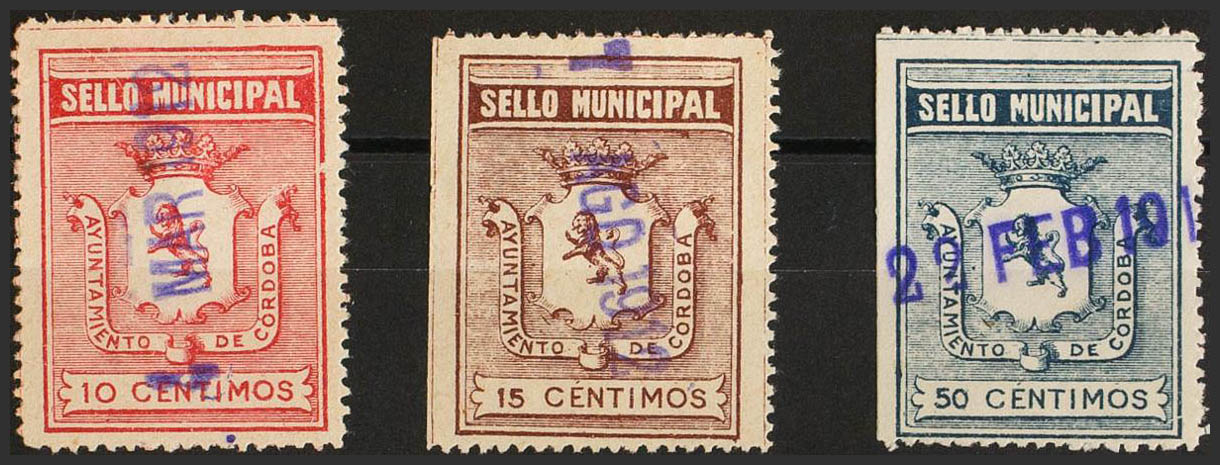 1912. CORDOVA. MUNICIPAL TAX of 1912. 10 cts red, 15 cts brown and 50 cts blue green. MAGNIFICENT.
