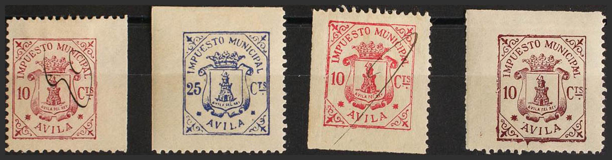 English |(*)/th|(1900ca). AVILA. MUNICIPAL TAX from (1900ca). 10 cts carmine, 10 cts pink, 10 cts carmine chestnut and 25 cts blue. MAGNIFICENT.