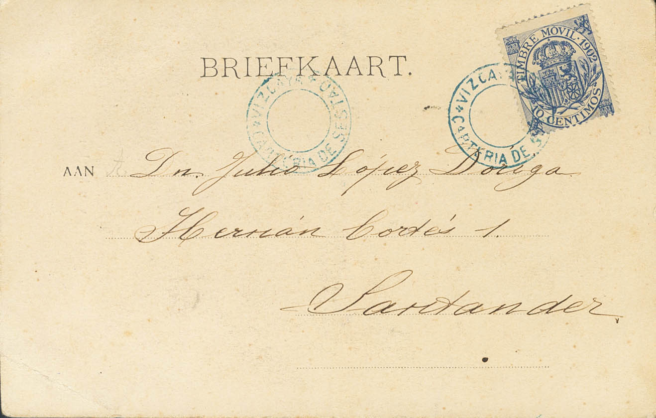 22. (1902ca). 10 cts blue, Mobile Bell (1902). Postcard from SESTAO to SANTANDER. Special postmark CARTERIA DE SESTAO / VIZCAYA (Type II), in blue. MAGNIFICENT AND VERY RARE.