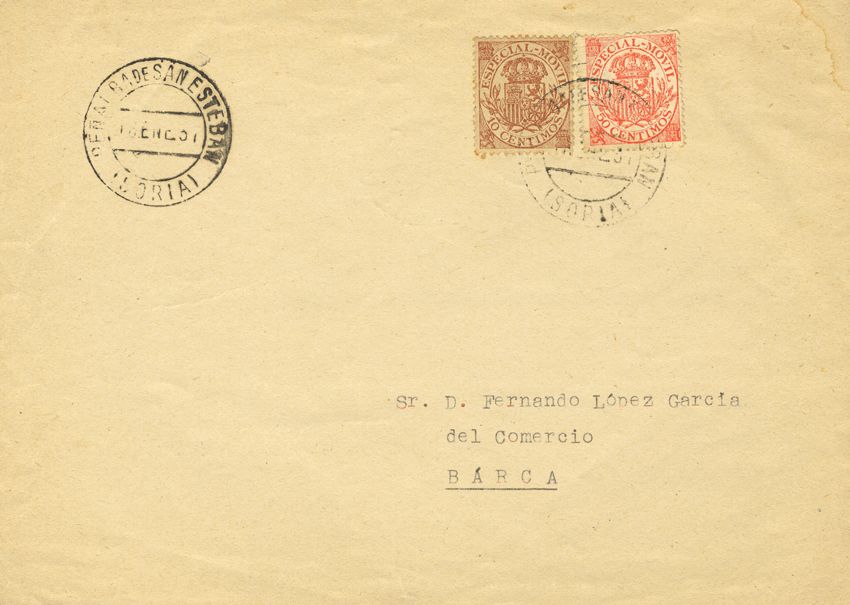 Phys 26/27. 1937. 10 cts chestnut and 50 cts orange MOBILE. PEÑALBA DE SAN ESTEBAN to BARCA (SORIA). On the back arrival. MAGNIFICENT.