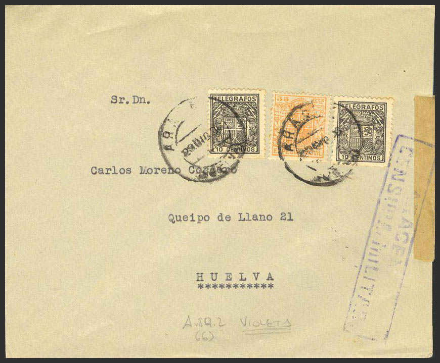 1938. 35 cts orange MOBILE. ARACENA to HUELVA. MAGNIFICENT AND NOT LISTED.