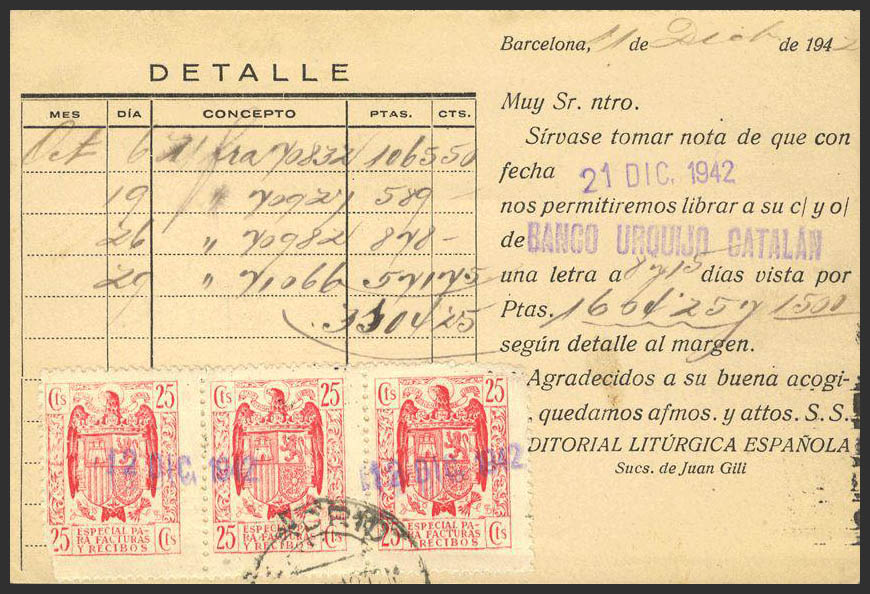 1942. 25 cts red, strip of three stamps INVOICES AND RECEIPTS. Postcard from BARCELONA to MADRID. MAGNIFICENT AND NOT LISTED.