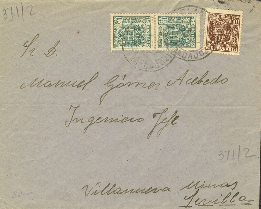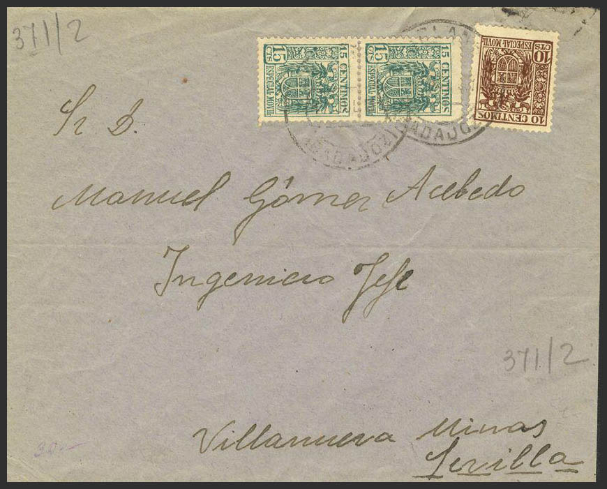 1931. 10 cts brown and 15 cts green, pair MOBILES. BERLANGA to SEVILLE. On the back arrival. MAGNIFICENT AND NOT LISTED.