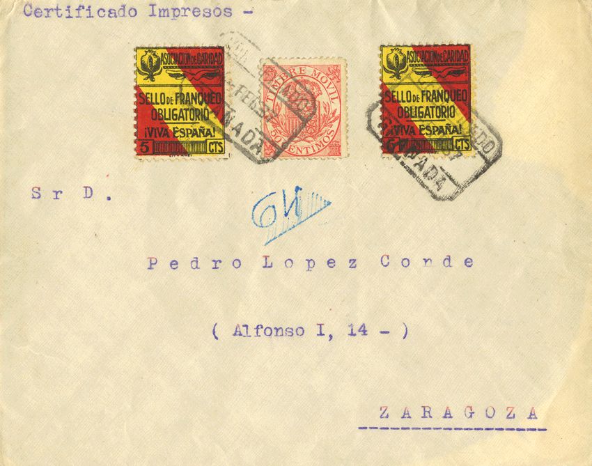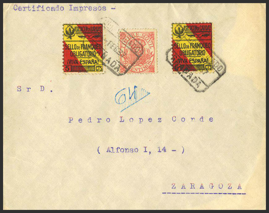 English 1937. 50 cts red MOBILE. Certificate from GRANADA to ZARAGOZA. On the back arrival. MAGNIFICENT.