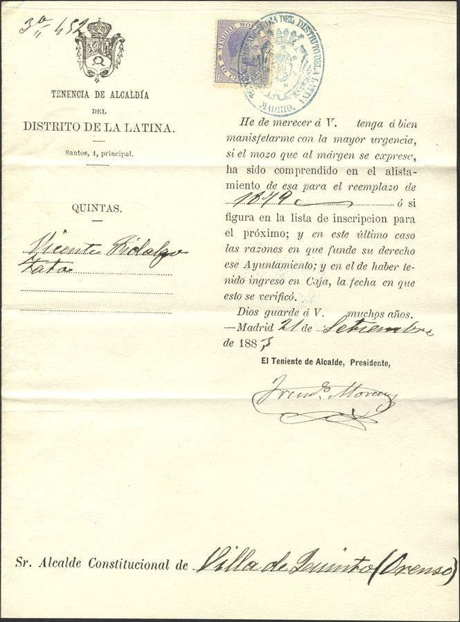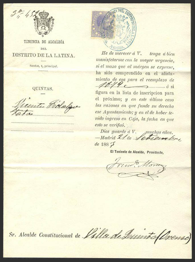 1883. FISCAL lilac 10 cts. Document from the Registry of Fifths from MADRID to ORENSE. MAGNIFICENT AND RARE.