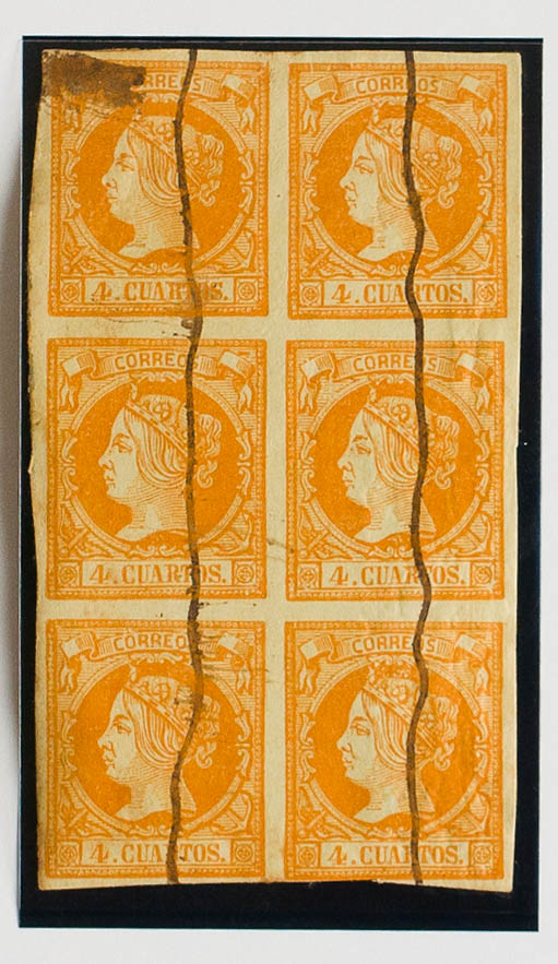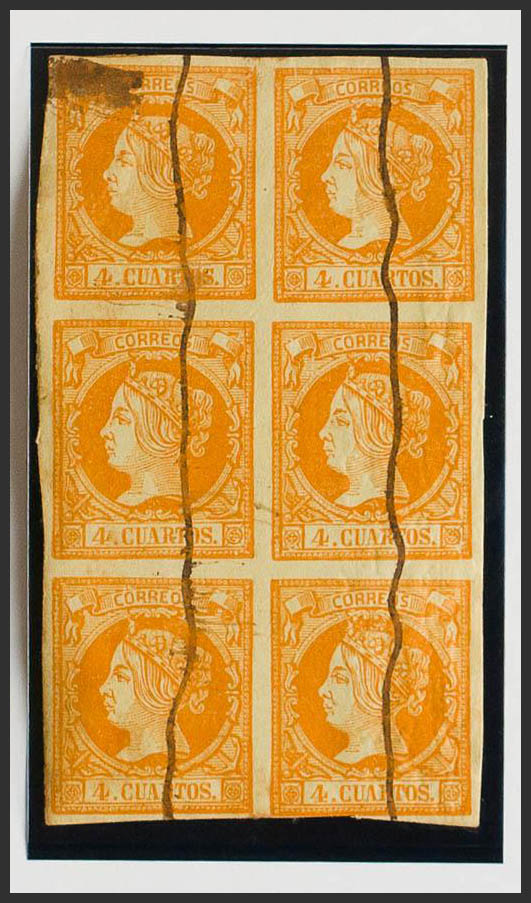 52F(6). 1860. 4 orange cuartos , block of six. FALSE POSTCARD TYPE III. Pen disabled. MAGNIFICENT AND VERY RARE BLOCKS OF THIS SIZE OF TYPE III.