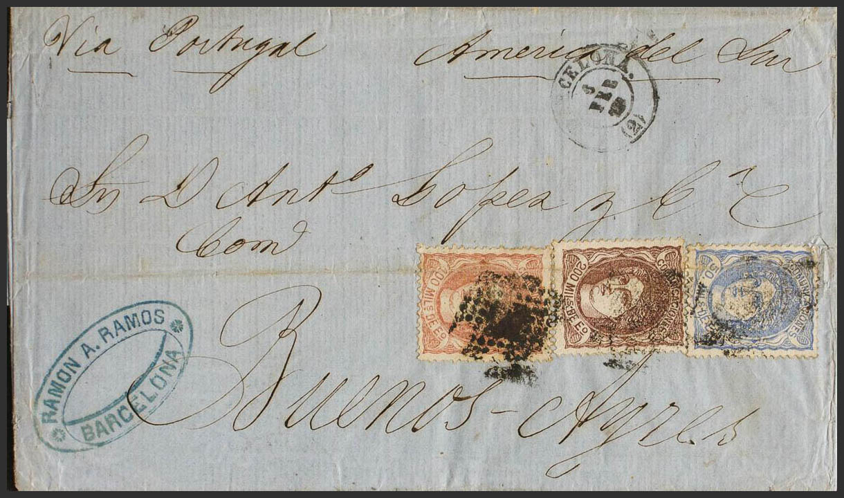 108F, 107, 109. 1872. 100 mils chestnut red FALSE POSTAL TYPE II, 50 mils ultramarine and 200 mils chestnut. BARCELONA to BUENOS AIRES (ARGENTINA) (file fold), circulated via Portugal with the rate of 350 mils. MAGNIFICENT AND EXTRAORDINARILY RARE POSTAGE WITH A FAKE POSTAL ADDRESSED TO ARGENTINA.