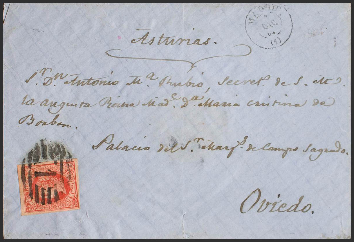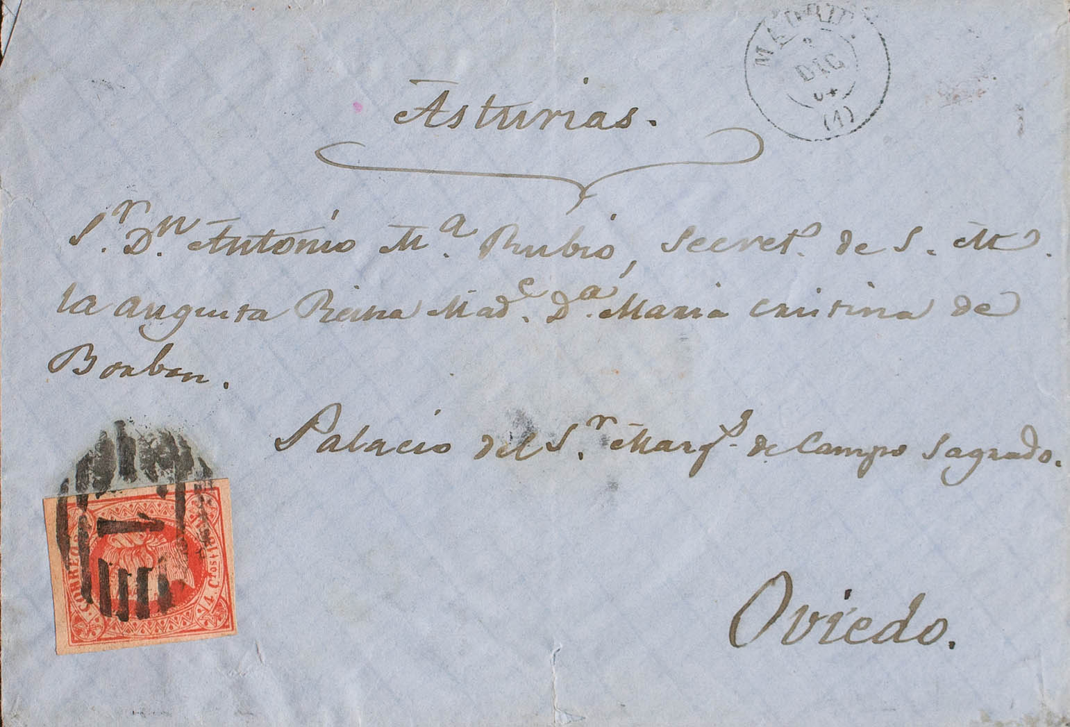64F. 1864. 4 cuartos red FALSE POSTCARD UNIQUE TYPE. MADRID to OVIEDO (addressed to the Secretary of the Queen, Dª Mª Cristina de Borbón, wife of Fernando VII and exiled in France since 1854). MAGNIFICENT AND VERY RARE REAL CORRESPONDENCE CIRCULATED WITH A FALSE POSTAL STAMP.