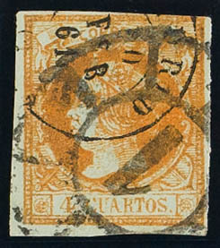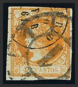 English 52F. 1860. 4 orange cuartos FALSE POSTCARD TYPE XV. Postmark R.CARRETA Nº1 and dater MADRID / (1). MAGNIFICENT AND RARE.