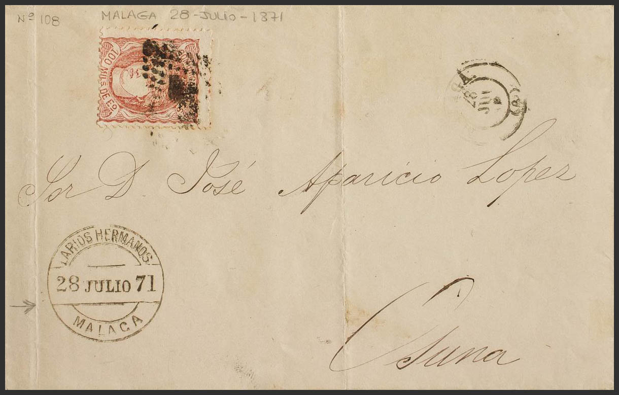 English 108F. 1871. 100 mils chestnut red FALSE POSTCARD TYPE II. MALAGA to OSUNA (Addressed to José Aparicio, this recipient used false postcards very frequently, he himself was in charge of supplying his senders with the false postcards of the different issues, saving his postal relations with the consequent economic benefit for his company). MAGNIFICENT AND RARE, COMPLETING THE DOUBLE SHIPPING RATE.
