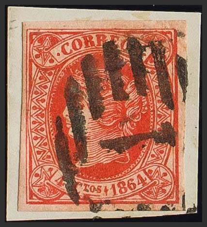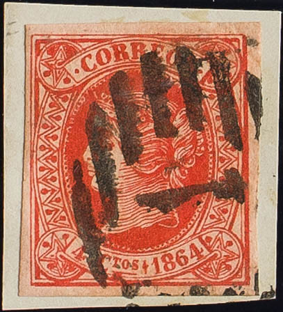 64F. 1864. 4 cuartos red FALSE POSTCARD UNIQUE TYPE. Postmark GRILL WITH Nº1. MAGNIFICENT AND UNUSUAL.