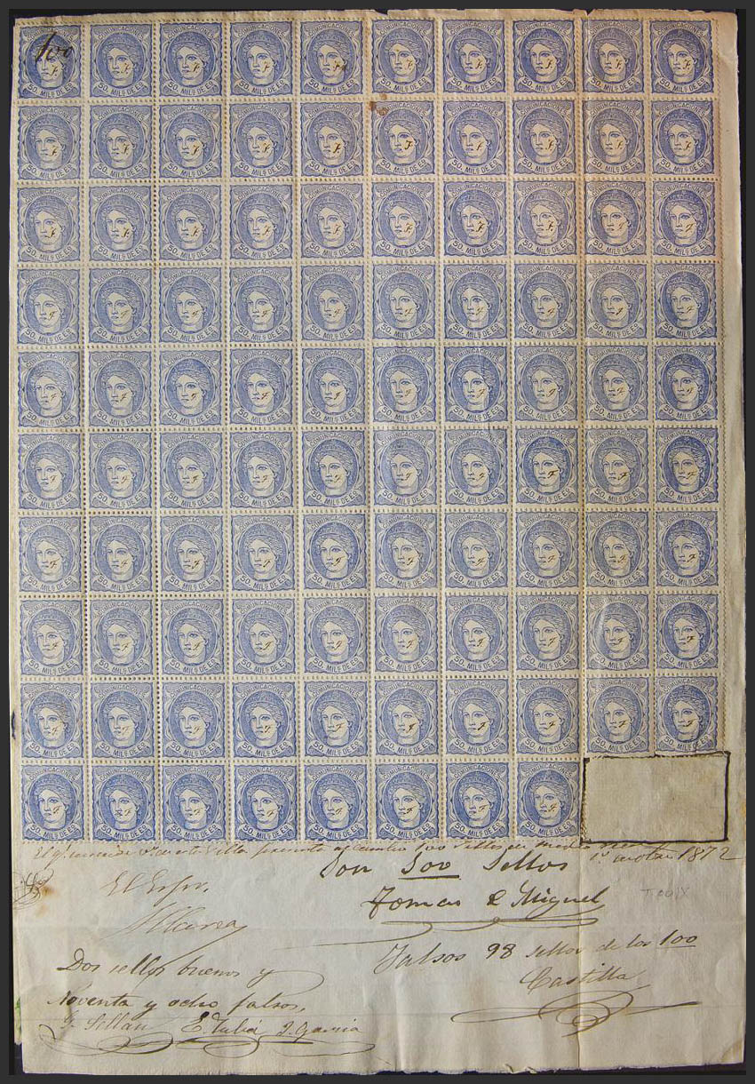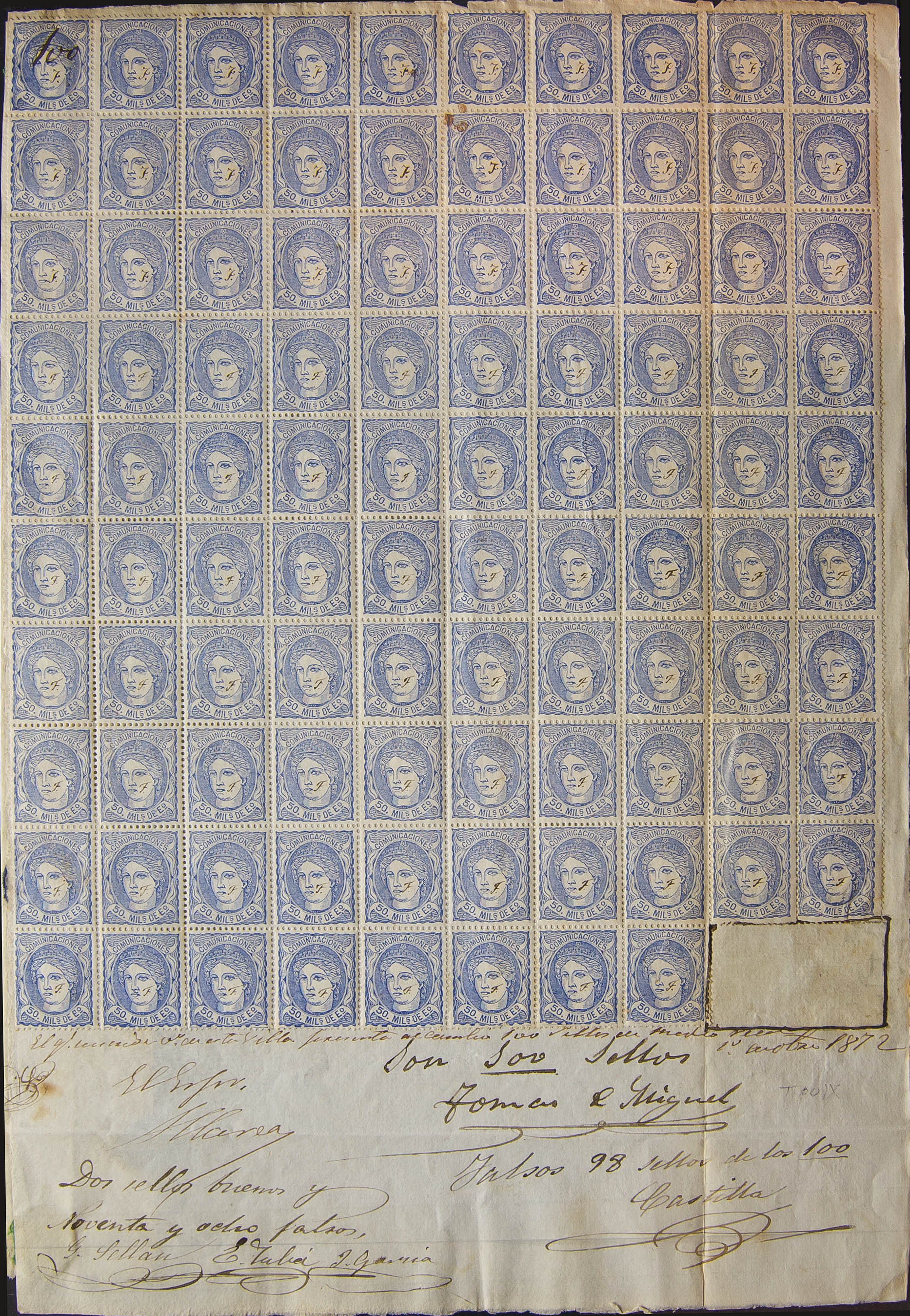107F(98). 1872. 50 mils overseas FALSE TYPE IX POSTAL, ninety-eight stamps affixed on file with handwritten inscription "False 98 stamps out of 100". This document is part of a file opened against the person who presented the false stamps to be exchanged at the tobacconist. MAGNIFICENT AND EXTREMELY RARE DOCUMENT BELONGING TO A FALSE POSTCARD DETECTED BY THE ADMINISTRATION. Ex-GRAUS.