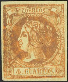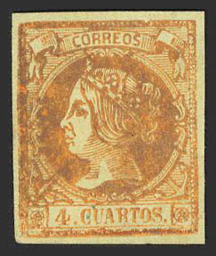★ 52F. 1860. 4 cuartos yellow. FAKE POSTCARD TYPE I, very diluted printing that makes it look like another type of fake post card. MAGNIFICENT AND VERY RARE, IT IS THE FIRST TIME THAT WE OFFER SUCH A COPY.