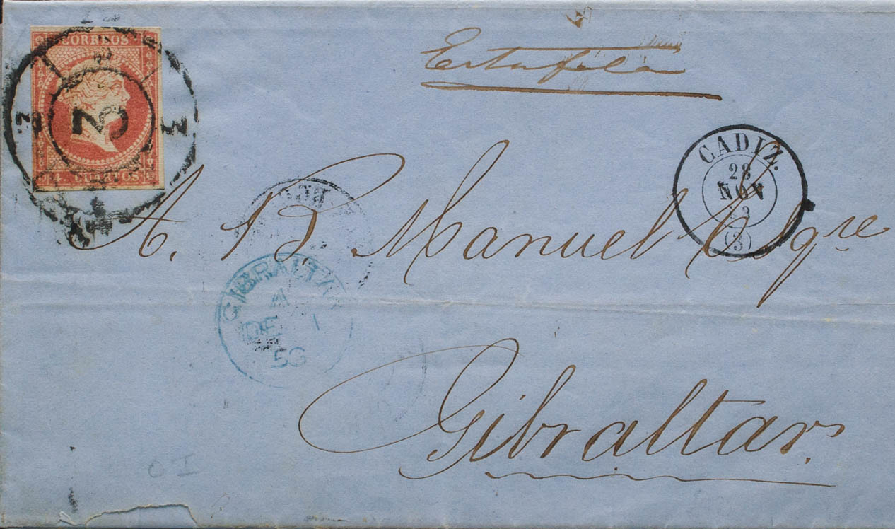 48. 1858. 4 red cuartos . CADIZ to GIBRALTAR. Postmark R.CARRETA Nº3, on the front date stamp GIBRALTAR, in blue. MAGNIFICENT AND VERY RARE DESTINATION, THERE ARE VERY FEW LETTERS ADDRESSED TO GIBRALTAR.
