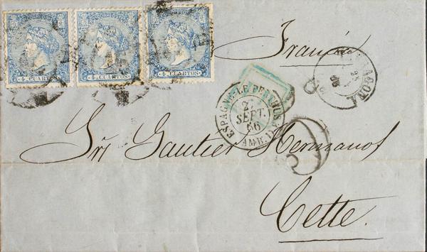 81(3). 1866. 4 blue cuartos , three stamps. TARRAGONA to CETTE (FRANCE). MAGNIFICENT AND UNUSUAL COMPOSITION OF THE RATE OF 12 ROOMS TO FRANCE.