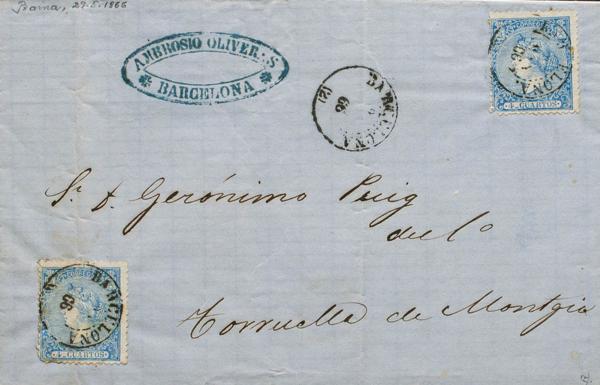 81(2). 1866. 4 blue cuartos , two stamps (one archival fold). BARCELONA to TORROELLA DE MONTGRI. Postmark BARCELONA / (2), double postage. PRETTY. Ex-Blight.