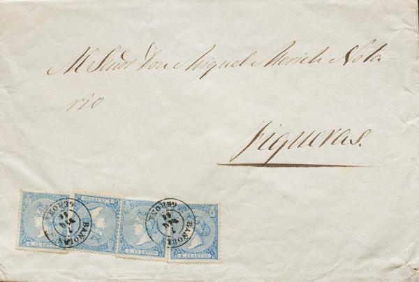 81(4). 1866. 4 blue cuartos , four stamps. BATHROOMS to FIGUERAS. Postmark BAÑOLAS / GERONA. MAGNIFICENT AND UNUSUAL FOUR POSTAGE POSTAGE. Ex-Blight.