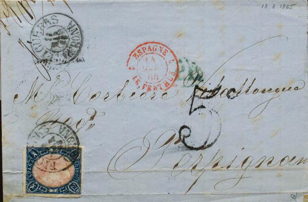 76. 1865. 12 blue and pink cuartos . SAN FELIU DE GUIXOLS to PERPIÑAN (FRANCE). Postmark SN. FELIU DE GUIXOLS / GERONA. MAGNIFICENT AND VERY RARE. Ex-Blight.