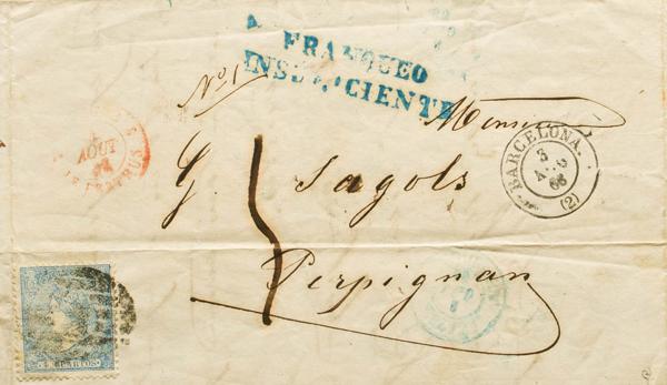 81. 1866. 4 cuartos blue. BARCELONA to PERPIÑAN (FRANCE). On the front it marks POSTAGE / INSUFFICIENT and French porterage "5". MAGNIFICENT AND VERY RARE, CIRCULATED TO FRANCE ONLY WITH A 4 QUARTER STAMP. Ex-Blight.
