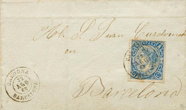 81. 1865. 4 cuartos blue. CARDONA to BARCELONA. Postmark CARDONA / BARCELONA. MAGNIFICENT AND RARE. Ex-Blight.