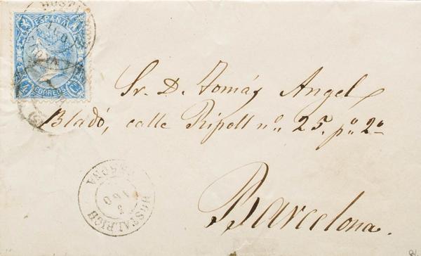 75. 1865. 4 cuartos blue. VICH to RIPOLL. Postmark VICH / BARCELONA. MAGNIFICENT. Ex-Blight.