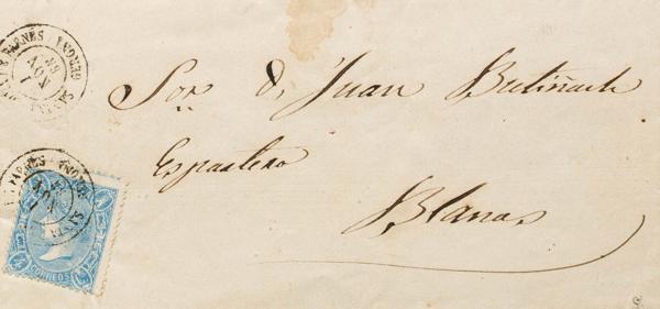 75. 1865. 4 cuartos blue. GRANOLLERS to ALBACETE. Postmark GRANOLLERS / BARCELONA. MAGNIFICENT. Ex-Blight.