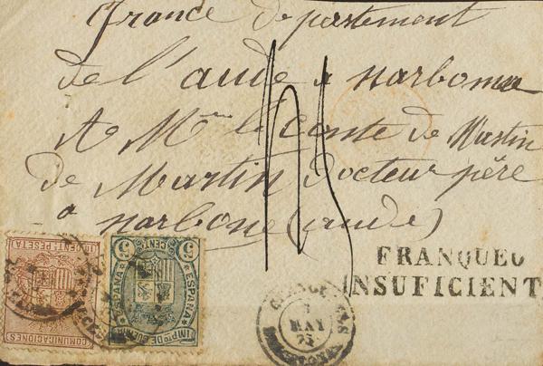 167. 1875. 40 chestnut cts. FIGUERAS to PERPIÑAN (FRANCE). Postmark FIGUERAS / GERONA. MAGNIFICENT AND RARE, CIRCULATED WITH EXCESS POSTAGE AS THE NEW RATE OF 25 CTS IS NOW IN FORCE. Ex-Blight.