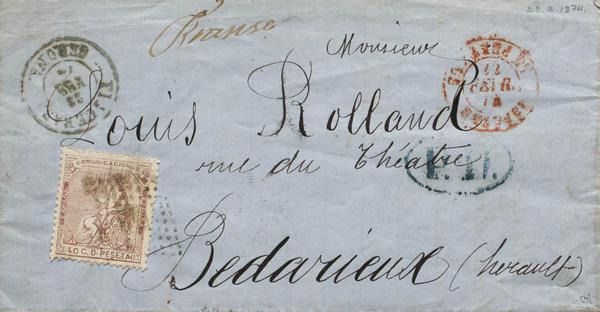 136. 1874. 40 cts chestnut violet. FIGUERAS to BEDARIEUX (FRANCE). MAGNIFICENT. Ex-Blight.