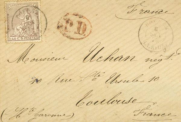 136. 1873. 40 cts chestnut violet. BOSOST (ARAN VALLEY, LERIDA) to TOULOUSE (in the absence of a rear flap, unimportant). Postmark BOSOST / LERIDA. MAGNIFICENT AND EXTREMELY RARE, IT IS POSSIBLY THE ONLY KNOWN CARD IN THIS ISSUE WITH THIS EXTREMELY RARE ORIGIN. Ex-Blight.