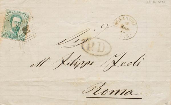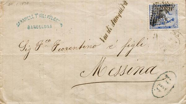 137. 1874. 50 overseas cts. BARCELONA to MESSINA (ITALY). On the front brand VIA DI JUNQUERA. MAGNIFICENT AND UNUSUAL DESTINATION. Ex-Blight.