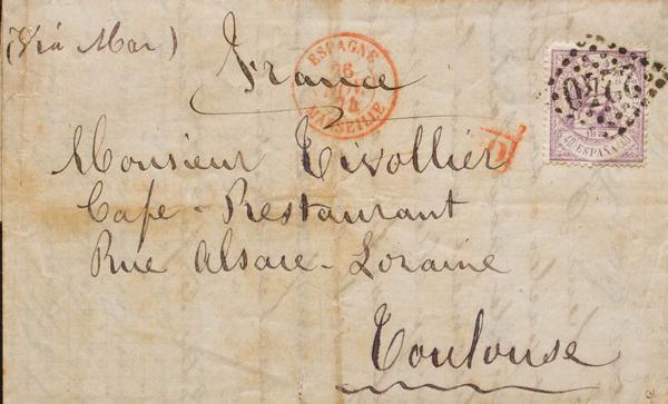 148. 1874. 40 cts violet. BARCELONA to TOULOUSE (FRANCE). French postmark "2240", applied in transit through Marseille and on the front handwritten indication "VÃa Mar". MAGNIFICENT. Ex-Blight.