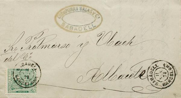 133. 1873. 10 cts green. TARRASA to BARCELONA. On the front dater TARRASA / BARCELONA. MAGNIFICENT. Ex-Blight.