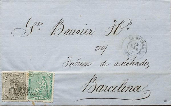 133, 141. 1874. 10 cts green and 5 cts black. LA BISBAL to BARCELONA. LA BISBAL / BARCELONA date stamp on the front. MAGNIFICENT. Ex-Blight.