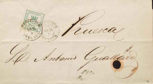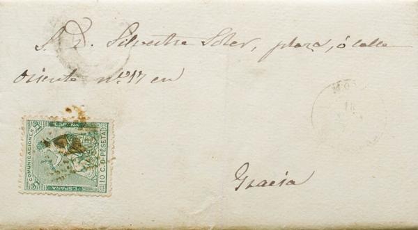 |ENVELOPE| 164, 154. 1875. 10 cts blue and 5 cts green War Tax. TORTOSA to BAGoodELONA. NINE-POINT OVAL postmark, which Tort in his work attributes to Montblanch (Tarragona). MAGNIFICENT AND EXTRAORDINARILY RARE. Cert. GRAUS.